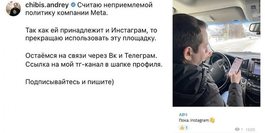Губернатор Мурманской области Андрей Чибис сообщил о том, что прекращает использование площадки Instagram в связи с тем, что считает неприемлемой политику компании Meta.