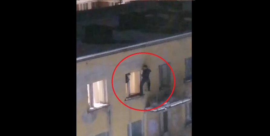 В мурманском общежитии подросток перелазил с балкона в окно на высоте пятого этажа. На камеру опасный маневр запечатлел местный житель.