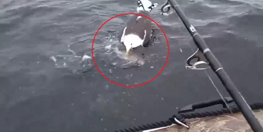 На видео рыбак пытается отогнать чайку от воды, кричит ей отдать его рыбу, но птица не сдается и изо всех сил пытается вырвать добычу с крючка.