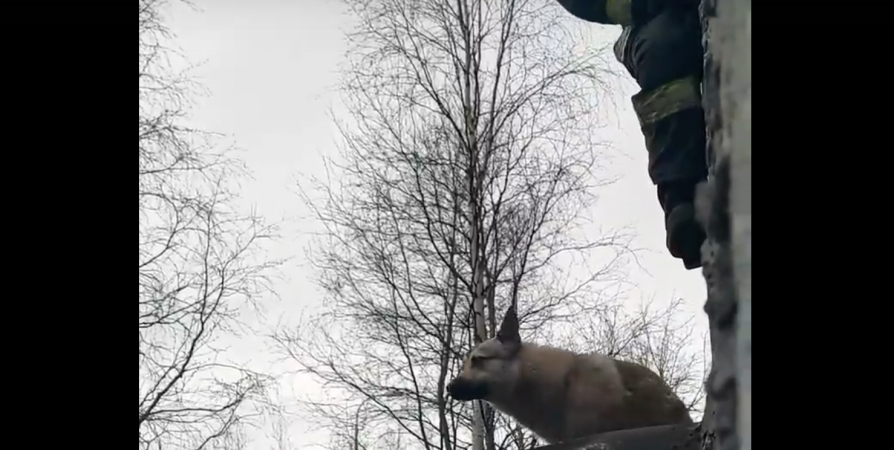 На опубликованном в соцсетях видео запечатлен испуганный пес, к которому пробирается через окно над козырьком подъезда спасатель. Собаку подзывают и успокаивают, чтобы можно было ее снять с крыши.