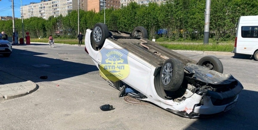 В Мурманске в районе Ледового озера у АЗС перевернулось авто. Об этом в социальных сетях сообщили местные жители.