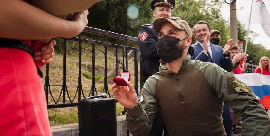 Вернувшийся со спецоперации в Мурманск росгвардеец сделал своей возлюбленной предложение сразу после поезда прямо на перроне.