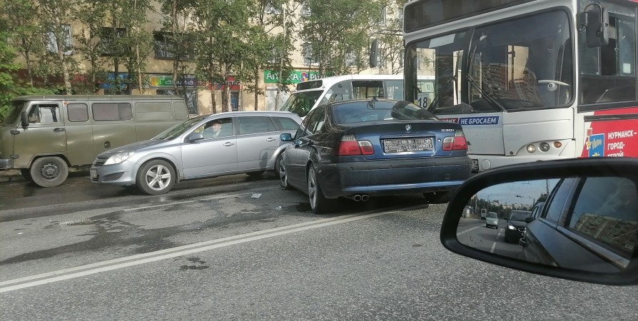 BMW и автобус №18 столкнулись на проспекте Героев-североморцев в Мурманске на пересечении с улицей Гаджиева.