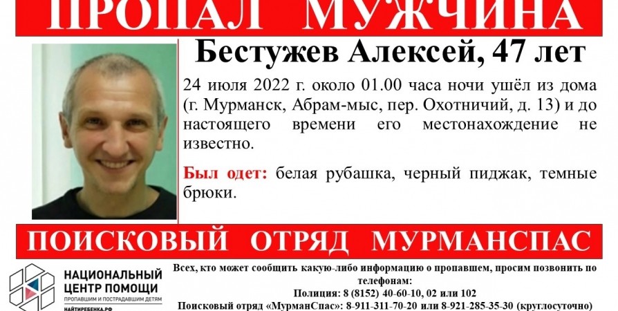 Пропал 47-летний житель Абрам-мыса Алексей Бестужев, сообщили волонтеры МурманСпаса.