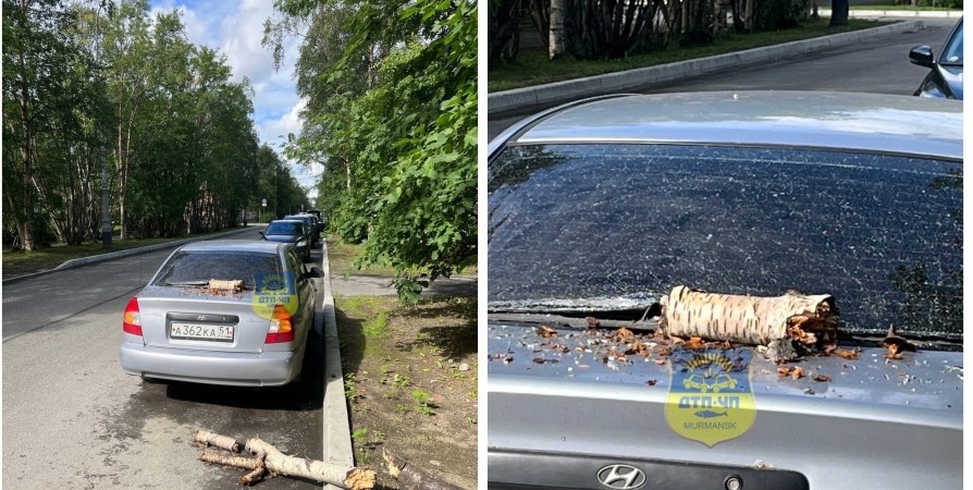 На припаркованную в Мурманске на улице Володарского, в районе дома №10 иномарку упала часть дерева. Судя по опубликованным в соцсетях фото с места происшествия, у машины повреждено заднее стекло.