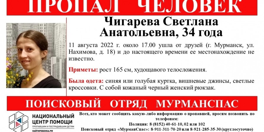 34-летнюю мурманчанку Светлану Чигареву разыскивают с прошлой недели, она с 11 августа около 17 часов ушла от друзей по улице Нахимова и пропала.