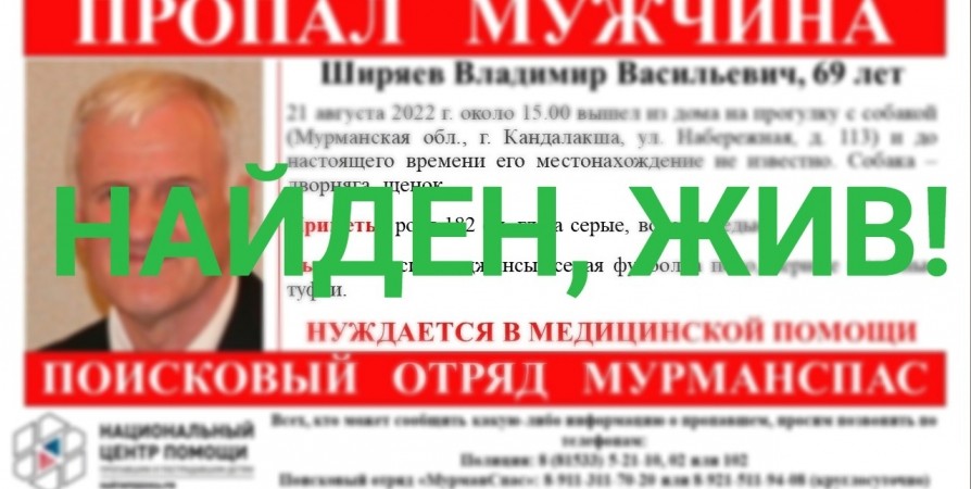 Пропавшего после прогулки с собакой 69-летнего пенсионера Владимира Ширяева из Кандалакши нашли живым, сообщили волонтеры МурманСпаса.