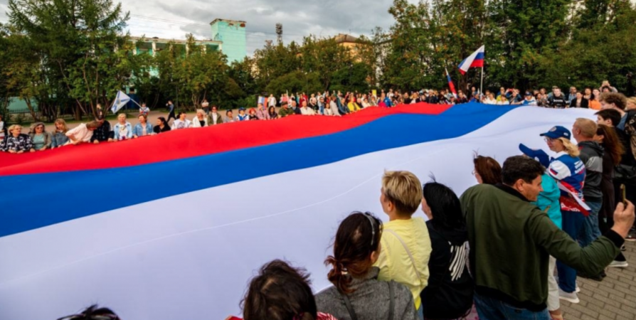 В центре Мурманска развернули большой флаг на праздничной акции «Триколор России», которая проходила в сквере на улице Ленинградской.