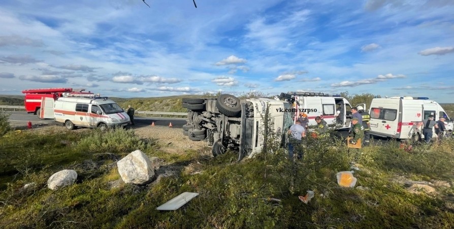На трассе «Кола» в Мурманской области недалеко от Спутника спасали водителя опрокинувшегося грузовика.