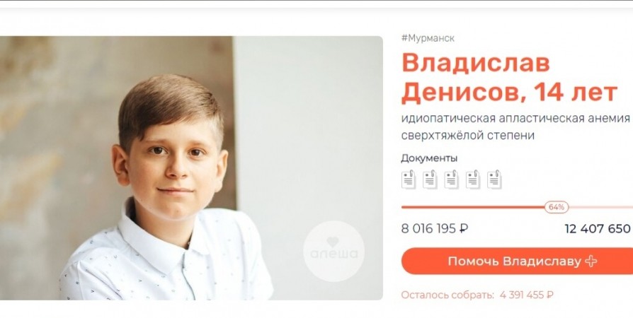 В благотворительном фонде «Алеша» собирают средства на лечение 14-летнего Владислава Денисова из Мурманска. У подростка диагностировано редкое и серьезное заболевание - идиопатическая апластическая анемия сверхтяжелой степени.