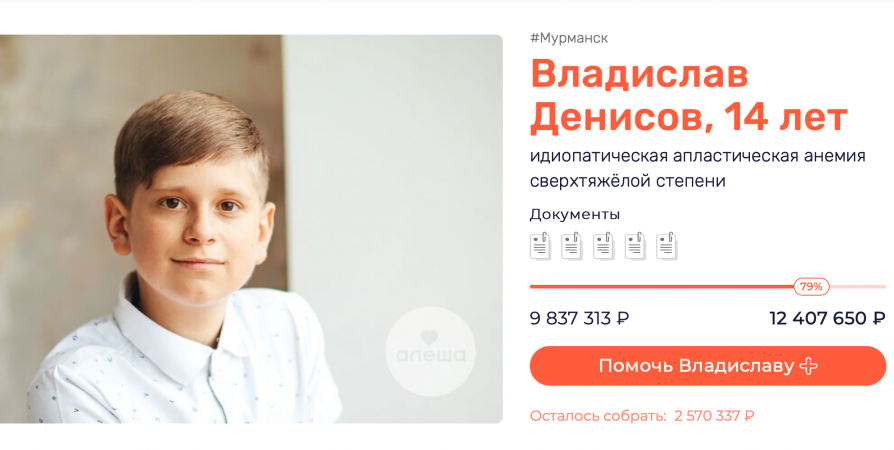 Для тяжелобольного 14-летнего Владислава Денисова из Мурманска осталось собрать чуть больше 2,5 млн рублей. В благотворительном фонде «Алеша» рассказали, что у подростка диагностировано редкое и серьезное заболевание - идиопатическая апластическая анемия сверхтяжелой степени.