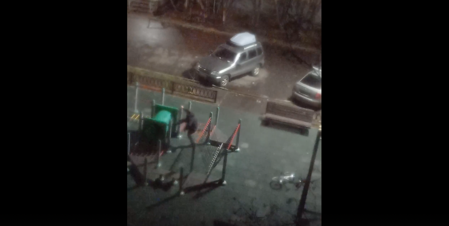 В Мурманске на улице Александра Невского мужчина пытался сломать ногой элемент детской площадки. Своим шумом он привлек внимание жителей ближайших домов, которые сняли его на видео.