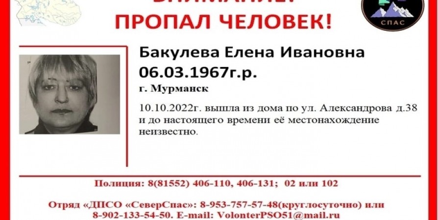В Мурманске 10 октября пропала Елена Бакулаева. Как сообщают волонтеры отряда «СеверСпас», женщина ушла из дома по адресу улица Александрова, 38, и не вернулась. Ее местонахождение на данный момент неизвестно.