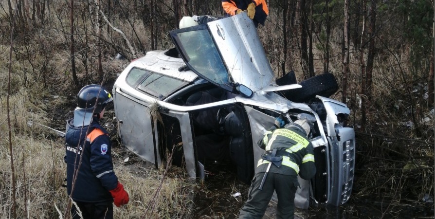 Водитель автомобиля Toyota RAV4 не справился с управлением и съехал в кювет. Машина перевернулась набок. Сотрудниками пожрано-спасательного подразделения спасено 4 пассажира.