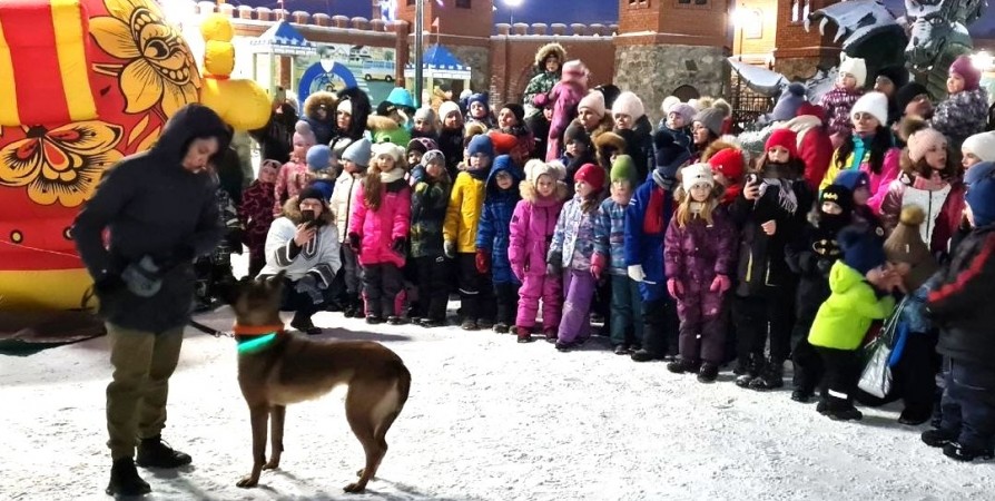 В мурманском детском городке «Сказка» у Семеновского озера состоялось торжественное открытие новогодней елки, в котором приняли участие сотрудники УФСИН с собаками.