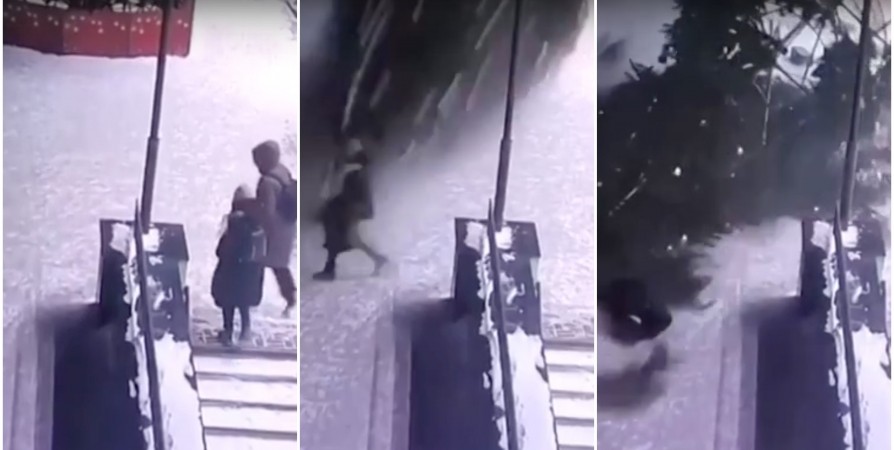 На видео запечатлено, как две женщины поднимаются по лестнице, и в этот момент праздничная конструкция сначала наклоняется в одну сторону, однако мгновенно меняет направление и падает на мимо проходящих женщин.
