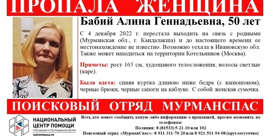 50-летняя жительница Кандалакши Алина Бабий уже более 1 месяца не выходит на связь с родными.