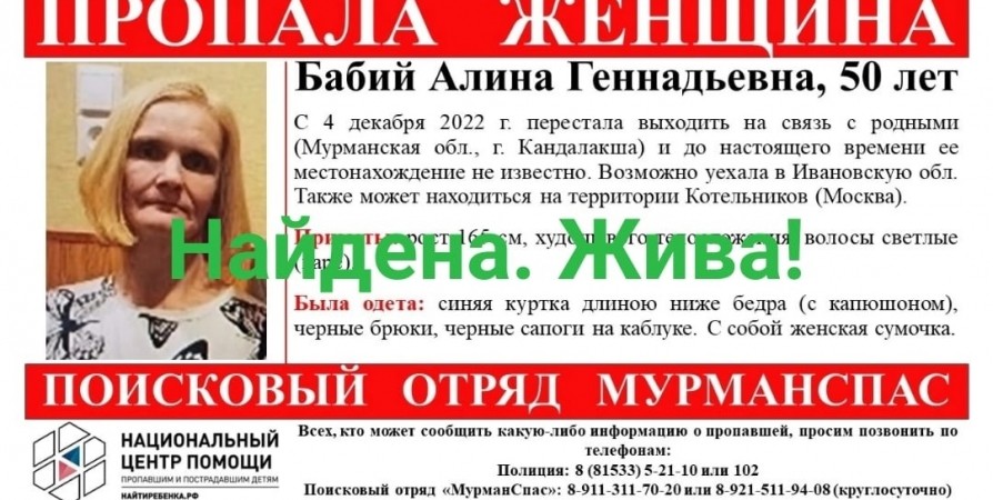 Завершены поиски 50-летней жительницы Кандалакши Алины Бабий, которая больше месяца не выходила на связь с родными.