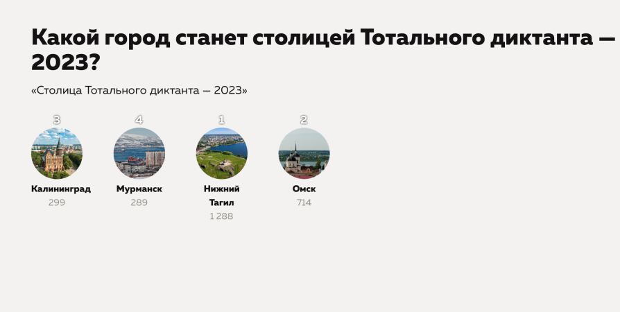 Мурманск сместился на 4 строчку в голосовании за столицу Тотального диктанта в 2023 году и в настоящий момент занял последнее место, пропустив вперед соперников - Нижний Тагил, Калининград и Омск.