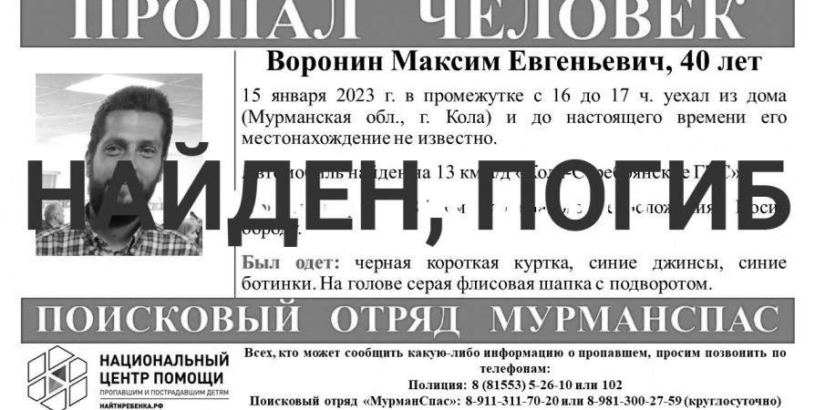 Погиб пропавший после ДТП, которое произошло 14 января по дороге в Териберку на 13 км трассы Кола-Серебрянские ГЭС, водитель микроавтобуса Peugeot Boxer - 40-летний Максим Воронин.