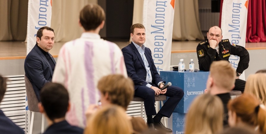 Министр Российской Федерации по развитию Дальнего Востока и Арктики Алексей Чекунков, губернатор Андрей Чибис и командующий Северным флотом адмирал Александр Моисеев в лицее №1 Североморска встретились с молодежью в рамках традиционного проекта «Арктический диалог».