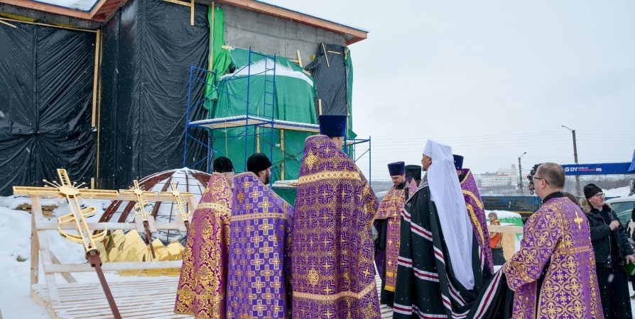 Митрополит Мурманский и Мончегорский Митрофан совершил чин освящения крестов и куполов строящегося Преображенского духовно-спортивного центра при храме «Спаса-на-Водах», установку которых начали сегодня утром.