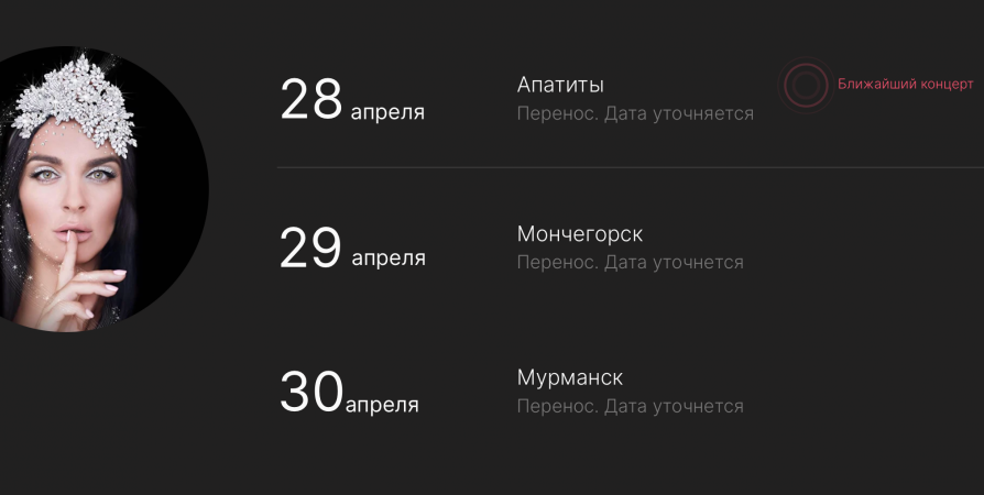 Концерты Елены Ваенги, которые должны были состояться в Мурманской области, в частности 28 апреля в Апатитах, 29 апреля в Мончегорске и 30 апреля в Мурманске, перенесли из-за болезни артистки.