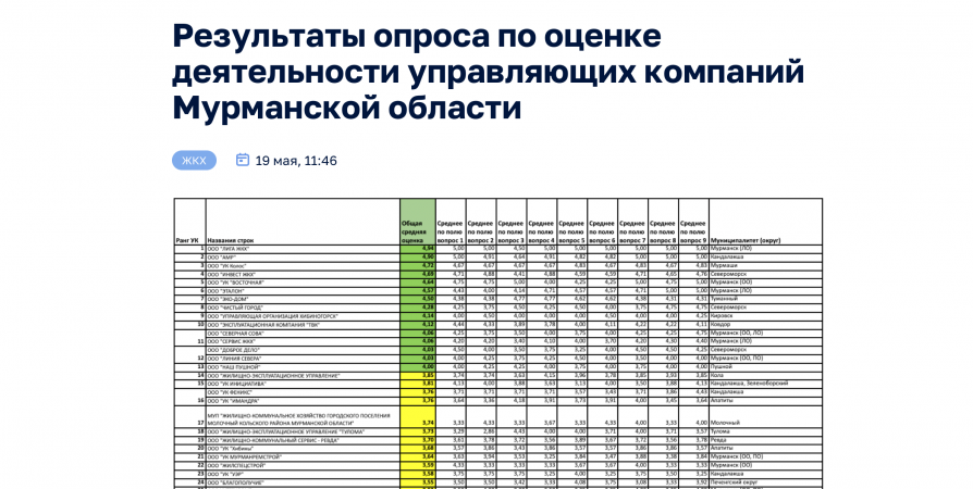 Наиболее качественно выполняющими свою работу признаны ООО «ЛИГА ЖКХ» (Мурманск), ООО «АМР» (Кандалакша), ООО «УК Колос» (Мурмаши), ООО «Инвест ЖКХ» (Североморск) и ООО «УК «Восточная» (Мурманск).