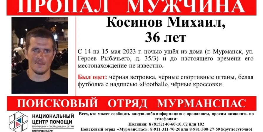 36-летний мурманчанин ушел из дома по улице Героев Рыбачьего в ночь на 15 мая и пропал.