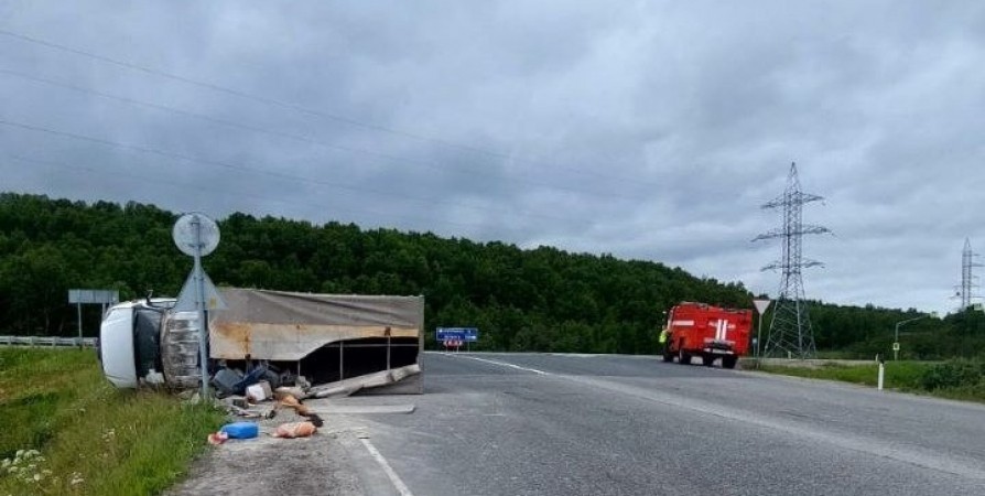 Грузовой автомобиль опрокинулся на бок, вылетев на обочину. О пострадавших не уточняется. Спасатели обеспечили безопасность на месте ДТП и отключили аккумулятор в машине.