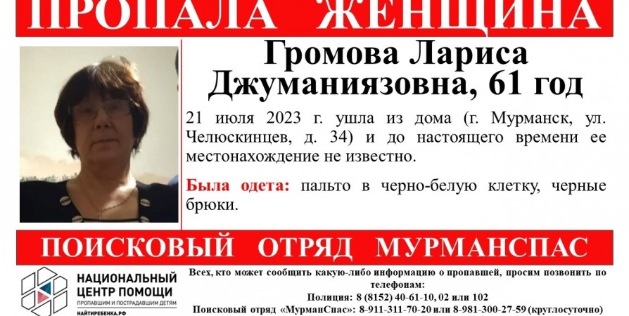 Как сообщили волонтеры МурманСпаса, 21 июля северянка ушла из дома по улице Челюскинцев. После о ее местонахождении ничего не известно.