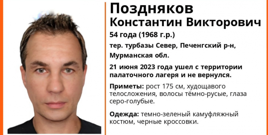 Почти два месяца разыскивают пропавшего 54-летнего Константина Позднякова, который ушел с территории палаточного лагеря на территории турбазы Север в Печенгском районе и не вернулся.
