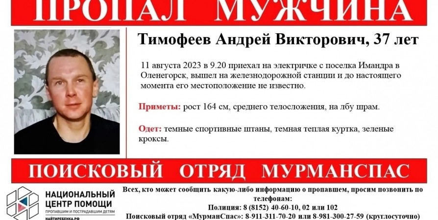 В Оленегорск на электричке с поселка Имандра приехал 37-летний Андрей Тимофеев и пропал.