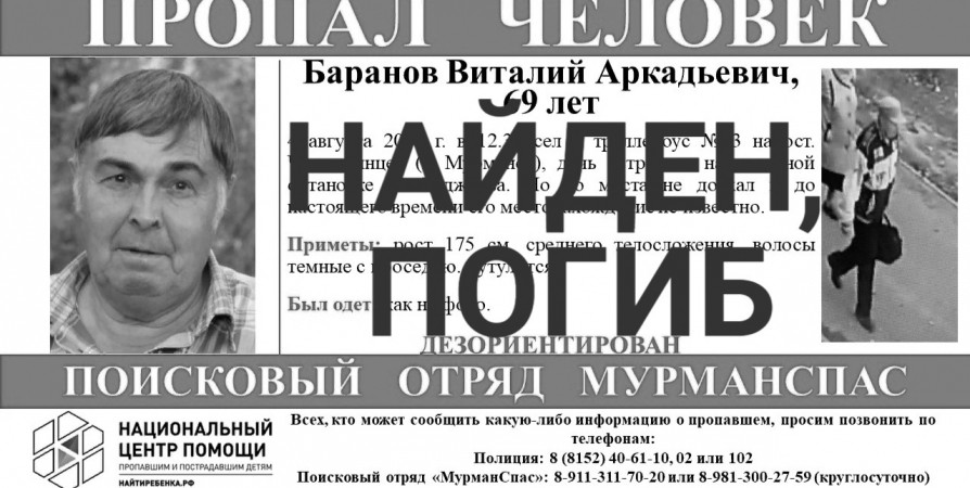 Пропавший 2 недели назад в Мурманске пенсионер 69 лет Виталий Баранов погиб, сообщили волонтеры МурманСпаса.