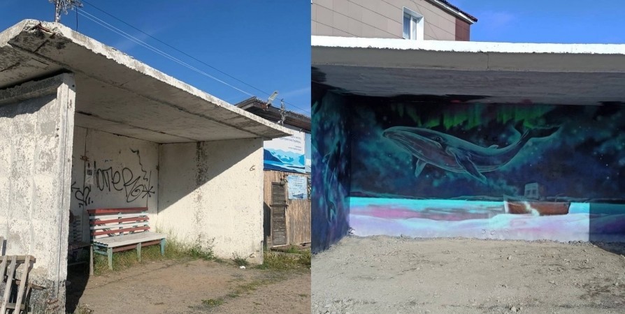 - Идея (корабль и кит с северным сиянием) была моя. Анна здорово ее визуализировала. После этого мы наняли школьников, они долго обрабатывали остановку, снимали старые слои, грунтовали, - рассказывает Надежда Банковская.