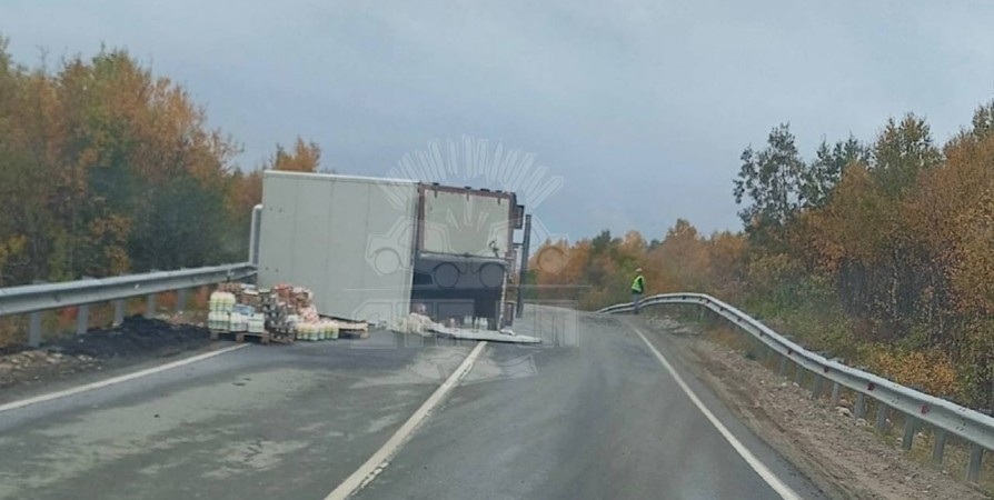 В Кольском районе на 14 км автоподъезда к поселку Ура-Губа опрокинулся большегруз с продуктами. Авария произошла около 10 утра 12 сентября.