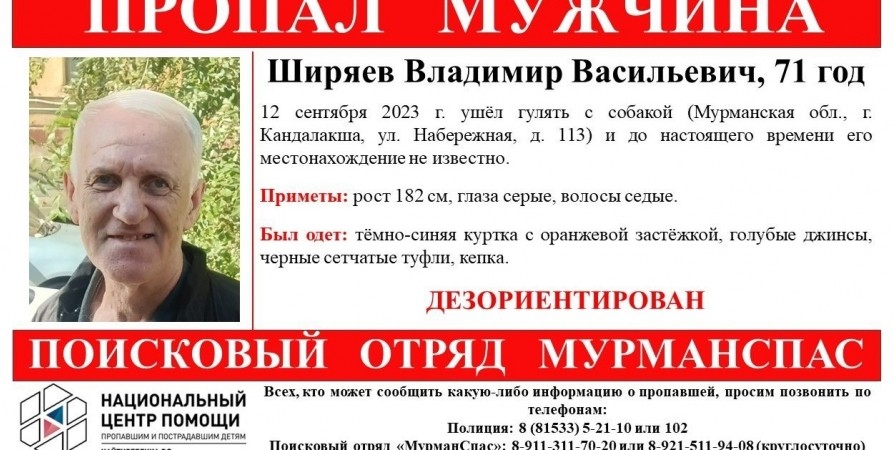 71-летний житель Кандалакши Владимир Ширяев 12 сентября ушел гулять с собакой из дома по улице Набережная и пропал.