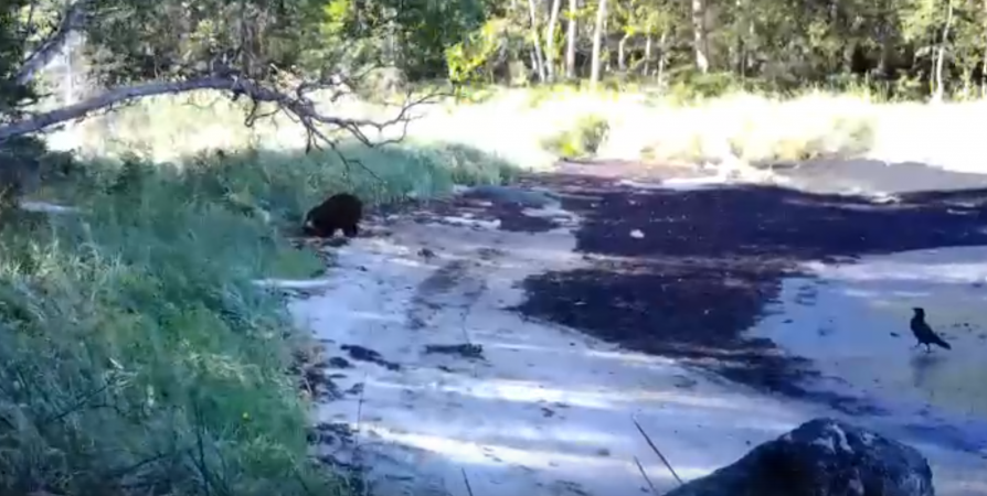 На острове Великий в Кандалакшском заповеднике в фотоловушку попал кадр встречи ворона с медведем. Птицу заинтересовал медведь, который в поисках съестного копался в песке на литорали.