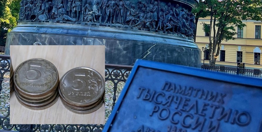 На купюре номиналом 5 рублей изображен Великий Новгород: с одной стороны - памятник «Тысячелетие России» на фоне Софийского собора, с другой - местный кремль.