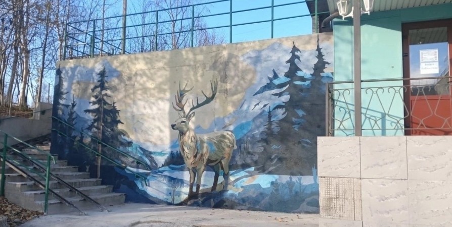 В микрорайоне Причальный в Мурмашах появился новый мурал - изображение оленя в северном лесу.