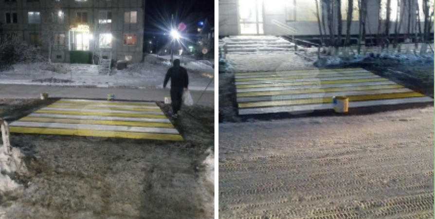 Глава ЗАТО Александровск Ильяс Мазитов объяснил Nord-News, что разметка нанесена на асфальт, снег предварительно счищали и прогревали дорогу специальным устройством – термоплитой.