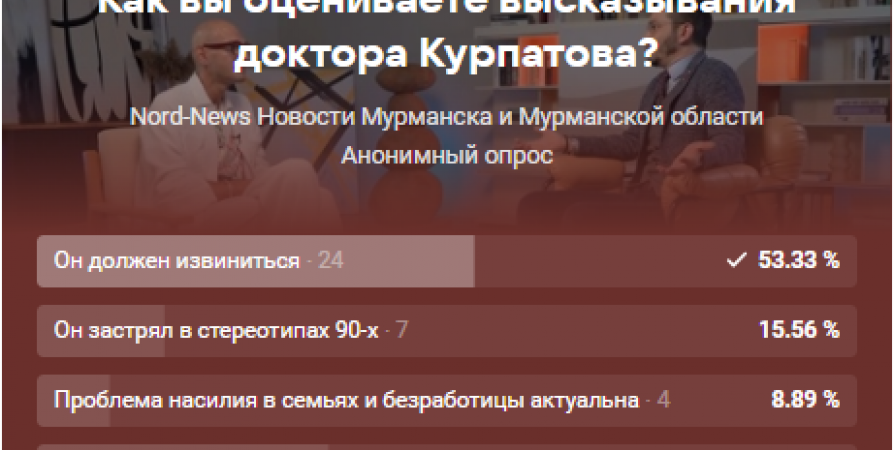 53% участников опроса ИА Nord-News считают, что допустивший в эфире оскорбительные высказывания о жителях Мурманска и Североморска психотерапевт Андрей Курпатов должен принести извинения.