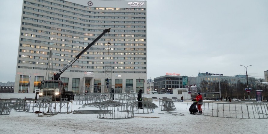 На площади Пять углов рабочие устанавливают каркас новогодней елки. В этом году создавать новогоднее настроение, как и в прошлом, будет дерево и иллюминация в форме шатра вокруг него.