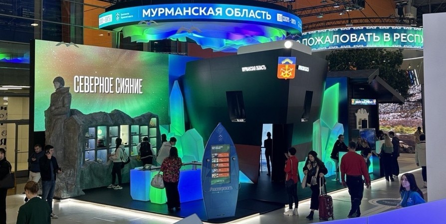 Стенд Мурманской области представляет собой интерактивный экран, на который опирается «Алеша», с другой стороны из него словно выходит нос ледокола. Часть экрана закрывает стеллаж с ячейками, из-за чего не всегда можно прочесть текст транслируемого видеоролика. Посредине - интерактивный информационный «стол», еще два экрана установлены в виде, наверное, сапбордов. На стенде - девушка-волонтер, которую мы и попросили подробно рассказать об экспозиции.