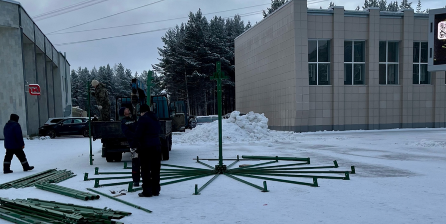 На центральной площади в Полярных Зорях началась установка новогодней елки, сообщили в МКУ «Управление городским хозяйством».