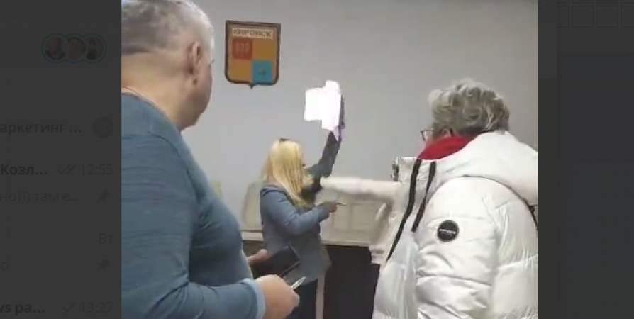 На записи видно скандал между оператором и депутатом городского совета Кировска Надеждой Новиковой. Народный избранник пытается запретить съемку и забрать телефон. Женский голос за кадром требует вызвать полицию.
