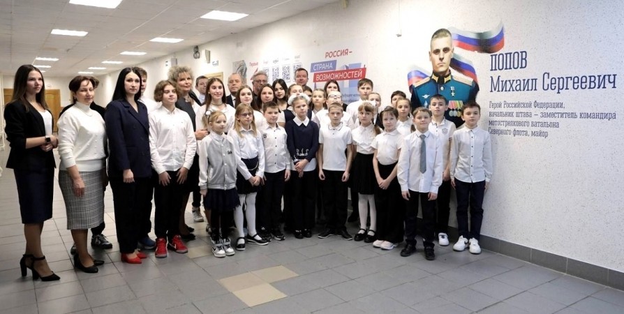 В школе № 289 в Заозёрске открыт мурал в честь Героя России Михаила Попова. Изображение появилось на стене в холле.