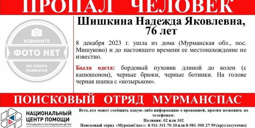 Волонтеры Мурманспаса сообщили, что произошло это 8 декабря, до настоящего времени ее местонахождение до сих пор не известно.