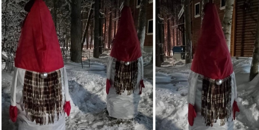 Бородатые гномики в нарядных новогодних колпаках появились на месте туй у ДК в Зеленоборском. Превращение растений в волшебных персонажей произошло благодаря заведующей постановочной частью Марии Спириной.