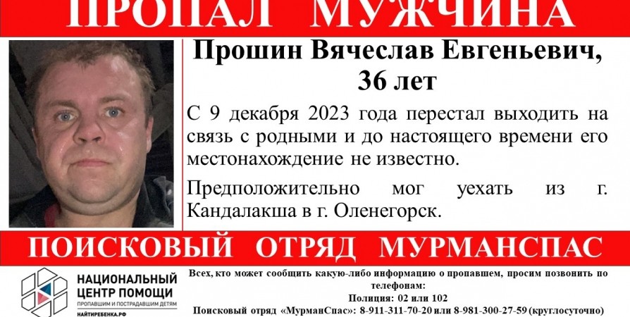 Предположительно из Кандалакши в Оленегорск уехал 36-летний Вячеслав Прошин и перестал выходить на связь с родными с 9 декабря.